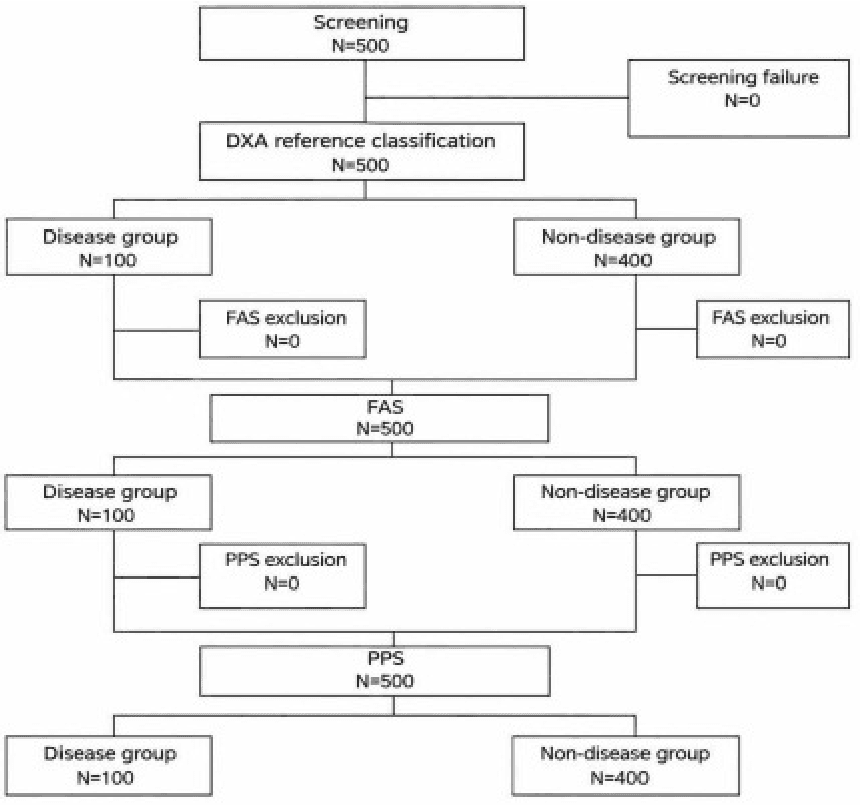 RESULTS: A total of 500 subjects were included. Osteo Signal met the predefined primary performance criterion, with the lower bound of the 95% confidence interval for AUC exceeding the threshold. The observed AUC was 0.866 (95% CI: 0.827–0.905) for detecting DXA-defined osteoporosis. Secondary performance measures showed a sensitivity of 77.0%, a specificity of 80.3%, a PPV of 49.4%, and an NPV of 93.3%. These findings demonstrated consistent screening performance in the study population.